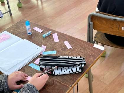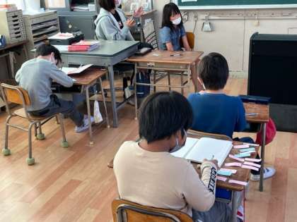 3年生が発表会をしていました。自分の好きなことや得意なことを相手にうまく伝えます。発表後にみんなからよかったところを書いた付箋をもらえていました。