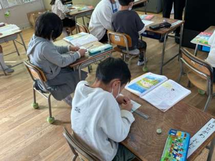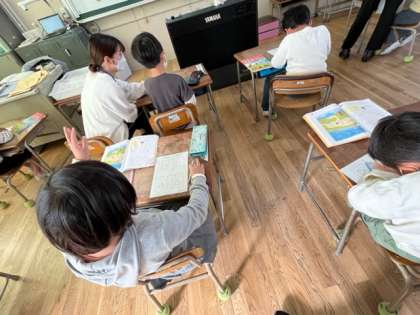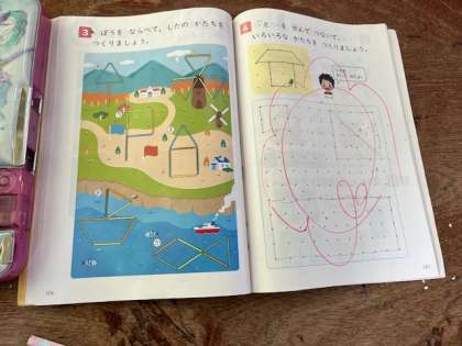 1年生が算数科の「いろいろなかたち」の学習で、線を引いて形づくりをしていました。見た通りの形にするのは1年生には難しい作業です。