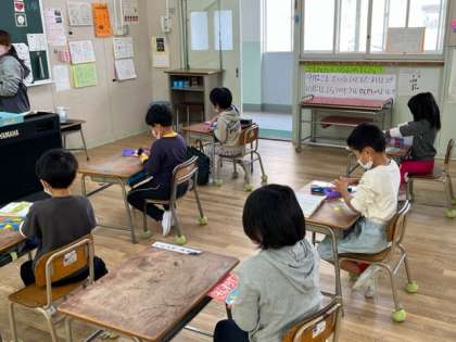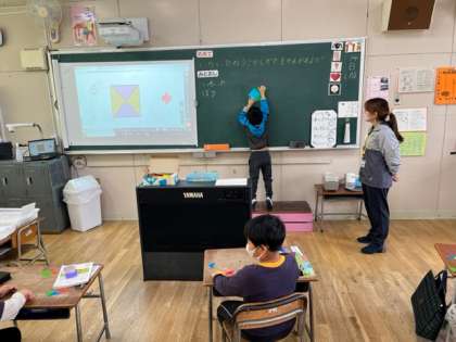 1年生が算数科の時間に「いろいた」を並べていました。三角形の同じ形を組み合わせてどんなものができるかな?