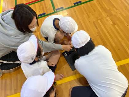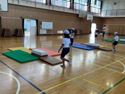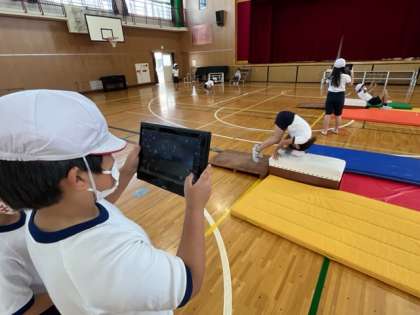 3年生の体育科の時間に学習端末を使い、台上前転している友だちの動きを録画していました。後で動画を見て、いいところを見つけていました。