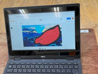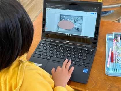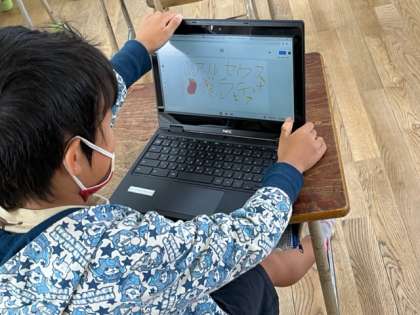 2年生が学習端末を使ってサツマイモのお話を作っていました。南の島に行ったり、北の国に行ったりするそうです。