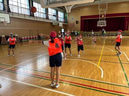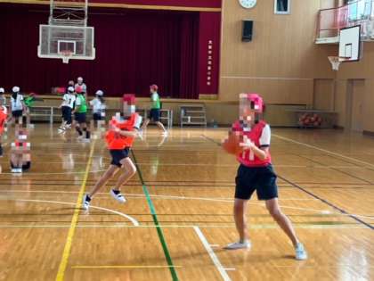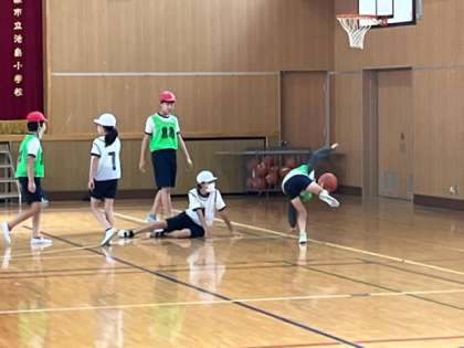 6年生が体育科でバスケットボールの試合をしていました。パスもシュートも上達していました。