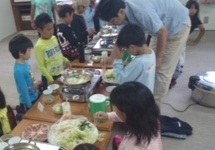 7月24日金曜日午後6時 5年生は夕食のかも鍋をいただいています。