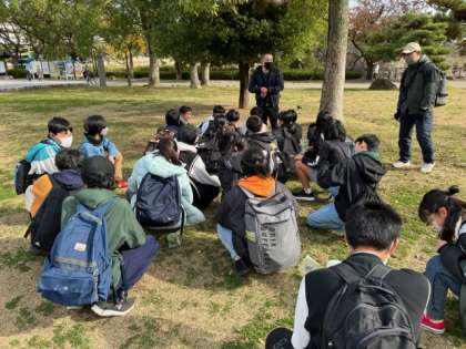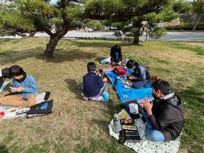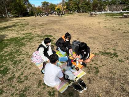 大阪城公園に移動してお昼ご飯です。友達と一緒にいただきます。