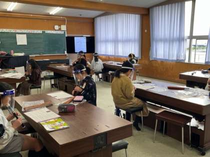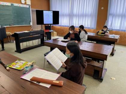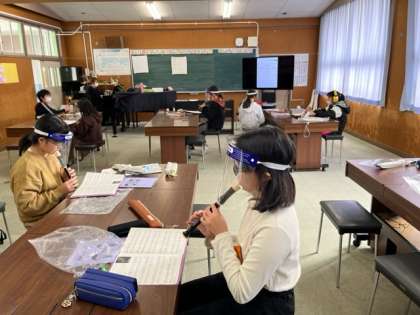 リコーダーの演奏はフェイスマスクご必要です。結構しんどいようです。5年生になると曲も難しいですね。