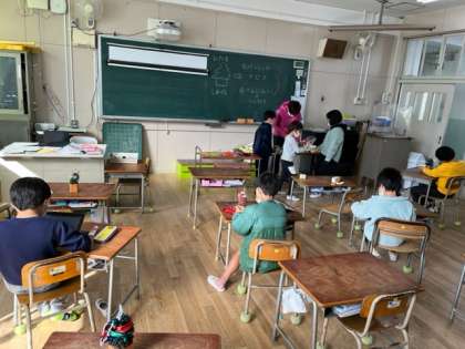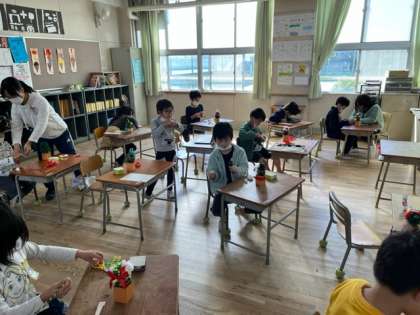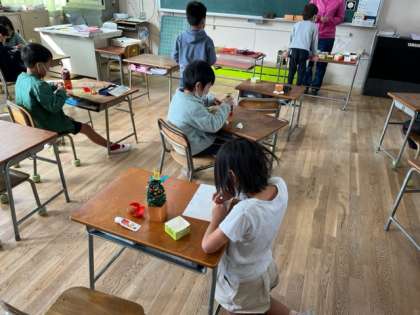 2年生ご図工の時間に大きな松ぼっくりを素材にクリスマスツリーを作っていました。それぞれに願いのこもったツリーです。