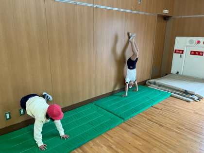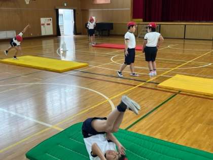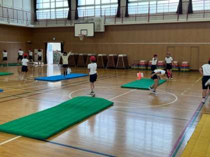 4年生が体育の時間にマット運動をしていました。前方回転、後方回転、側方倒立回転といろいろな技に挑戦していました。
