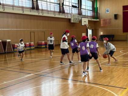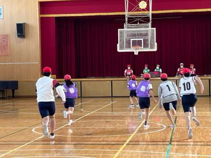 6年生が体育で学習してきたバスケットボールの試合をしていました。体育館全面のコートを使って走ったりパスしたりシュートしたり、楽しい時間を過ごしていました。