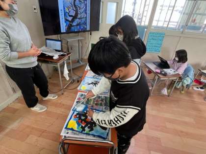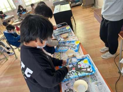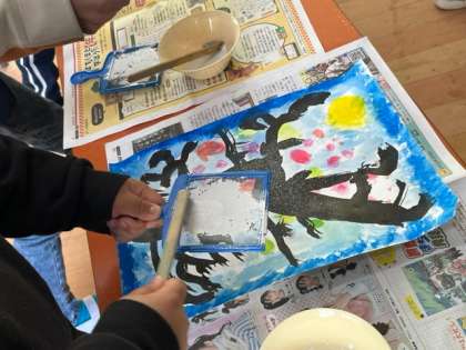 3年生の図工の時間。以前かいていた「もちもちの木」の絵に雪をふらしていました。幻想的な雰囲気が高まりますね。