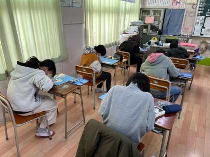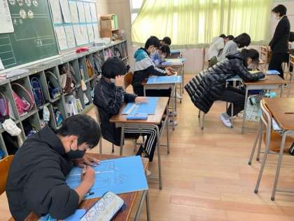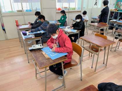 6年生が図工科の時間に「版画」の木版を彫刻刀で彫っていました。鏡文字や細かい部分に気をつけて真剣に彫り進めていました。