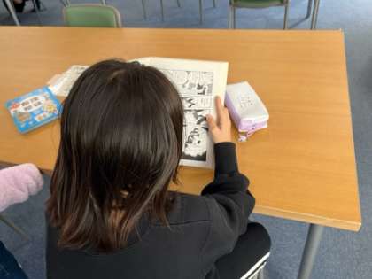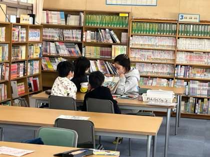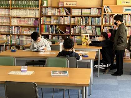 3年生の図書の時間です。先生に読んでもらったり、自分の好きな本を読んだり、思い思いに読書しています。