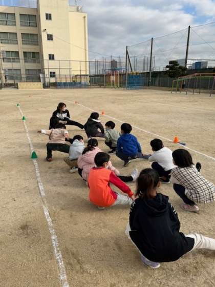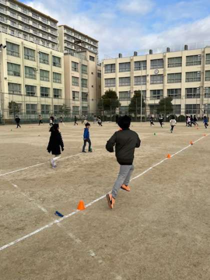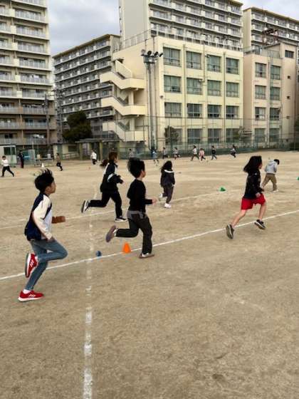 準備運動をしっかりして、最初はみんなで走ります。その後、自分のペースを考えて走ります。時間いっぱいがんばります。