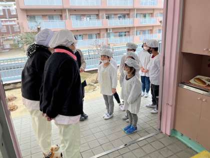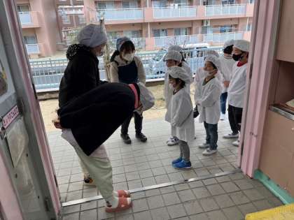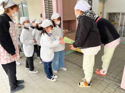 それぞれ代表の子が手紙を渡します。「いつもおいしい給食を作ってくださってありがとうございます。」