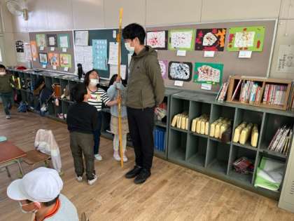 2年生の子どもたちが1メートル物差を使って長さを測っていました。先生は1メートル95センチメートルだそうです。大きすぎない?