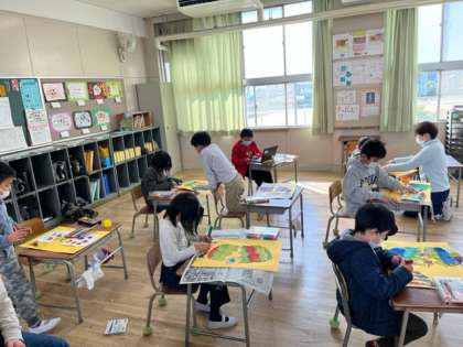 2年生の図工の時間です。カラフルなたまごからかわいい恐竜が生まれています。今日は色塗りに真剣に取り組みます。