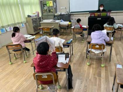 「とんくるりんぱんくるりん」かわいい歌声が聞こえます。1年生が卒業生を送る会で歌う歌の練習をしていました。