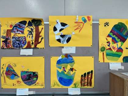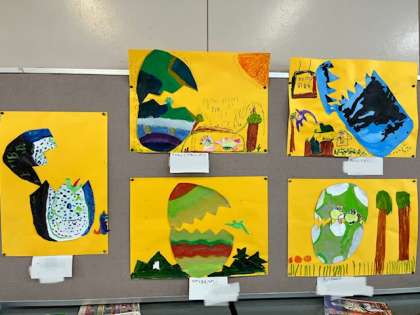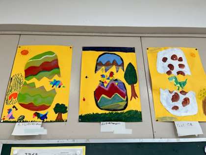みんなの恐竜のたまごが完成しました。いろんなたまごから恐竜が生まれています。
