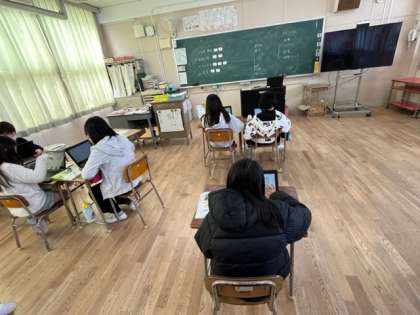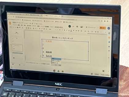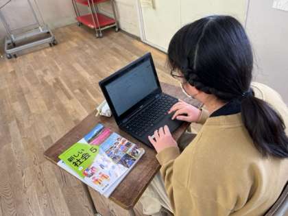 5年生は、社会科の時間に「自然災害」について調べて、スライドを作っていました。台風、地震、津波、大雪など対策も含めて調べるかな。