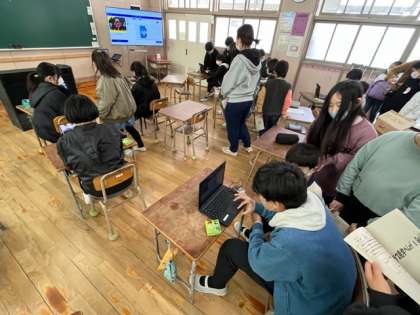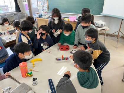 3年生のクラブ見学会です。初めにプログラミングクラブで、micro-bitの使い方を見て、次に科学工作クラブでプラ板制作を見ました。