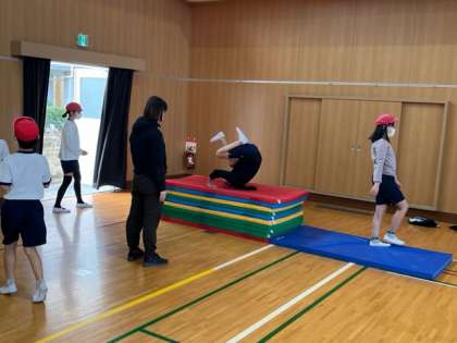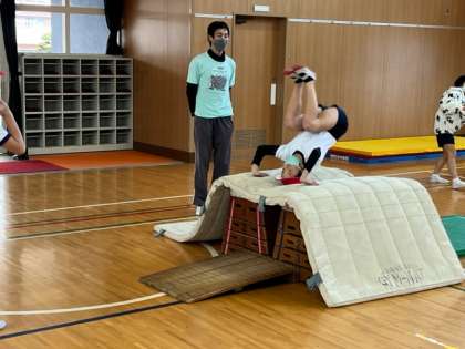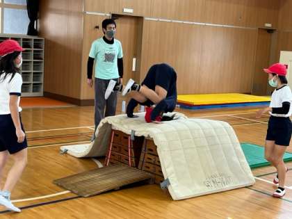 5年生が体育の時間に台上前転に挑戦していました。まっすぐ回転するのがコツですね。