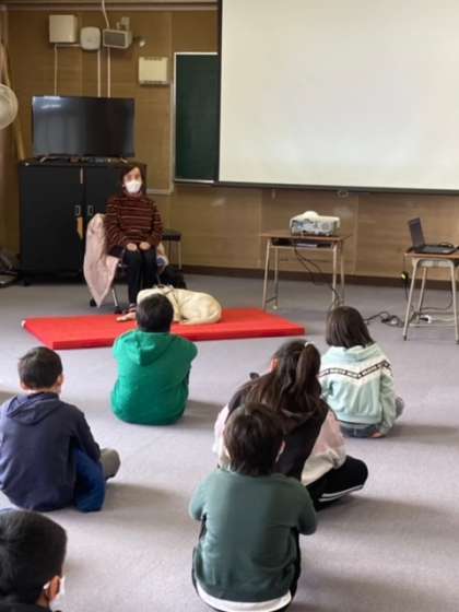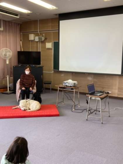 3年生は、毎年この時期に盲導犬の体験学習をします。初めに目の不自由な暮らしや、盲導犬の仕事などの話を聞きました。