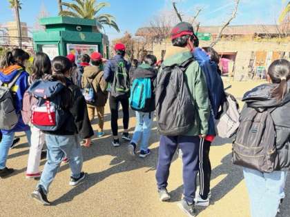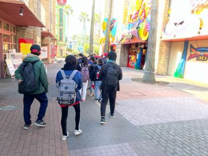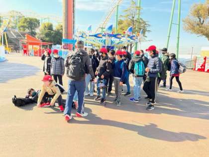 集合時刻と集合場所を確認して、記念撮影をします。早く自由行動に行きたいね。