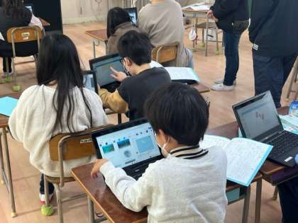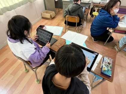 3年生の国語の時間です。国や地域によった暮らしがあることを学習した後、自分たちで調べて発表します。そのためのスライドを作っていました。
