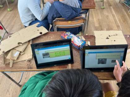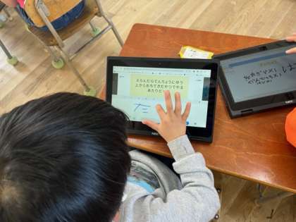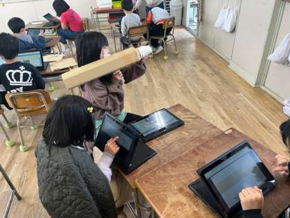 2年生は生活科で作ったおもちゃのことを、材料や作り方から説明できるようにスライドを作っていました。おもちゃの写真を載せたり、手書き入力で遊び方を説明したりしています。