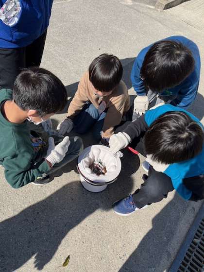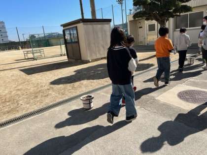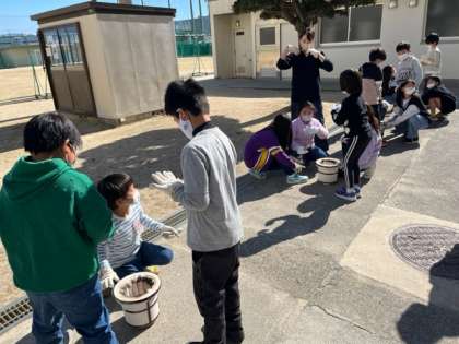 昨日3年生が社会科の「むかしのくらし」の体験で七輪を使っておもちを焼きました。初めに炭に火を起こします。管理作業員さんに手伝っていただいておっかなびっくり挑戦です。