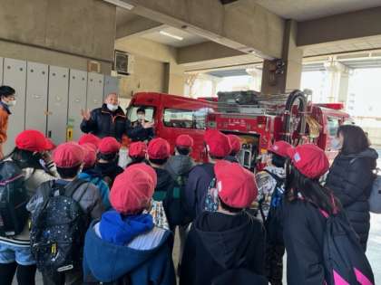 3月1日 3年生が港消防署に社会見学に行きました。初めは消防車両の説明を聞きました。