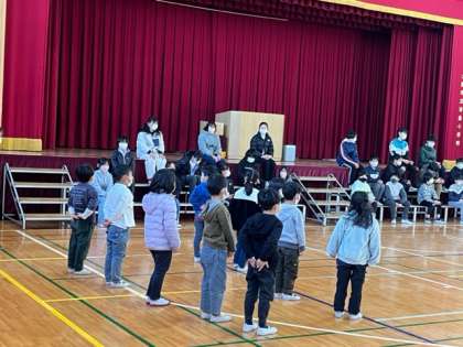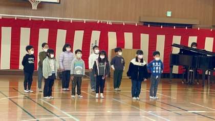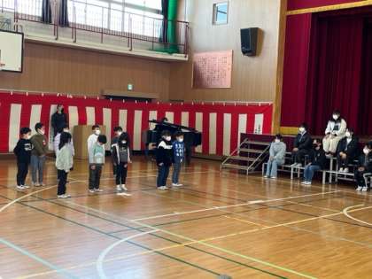 各学年からのお別れの言葉と演奏がありました。1年生から順番に披露します。1年生は、「春夏秋冬」の替え歌で6年生にありがとうを伝えました。