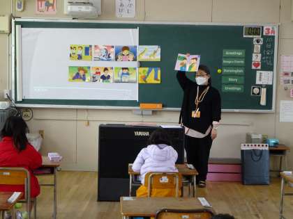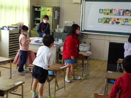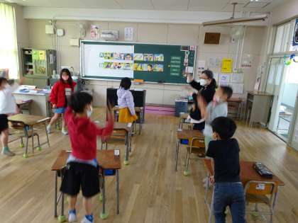 1年生が外国語活動の学習をしていました。今年度最後の学習です。外部講師に来ていただき1年間楽しく学習できました。耳が育っているとお聞きしました。