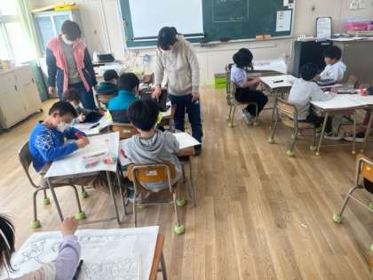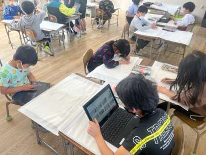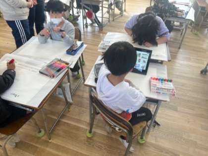 2年生は、図工の作品を入れるための作品袋を作っていました。学習端末で調べたり本を見たりして絵を描いていました。