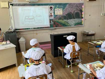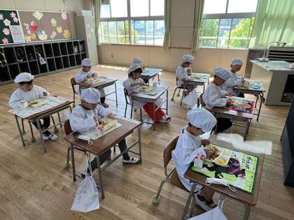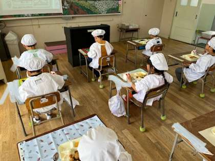 1年生ご初めて給食をいただきました。カレーは美味しいらしいです。たくさん食べる子が多かったです。いい姿勢で食べてますね。