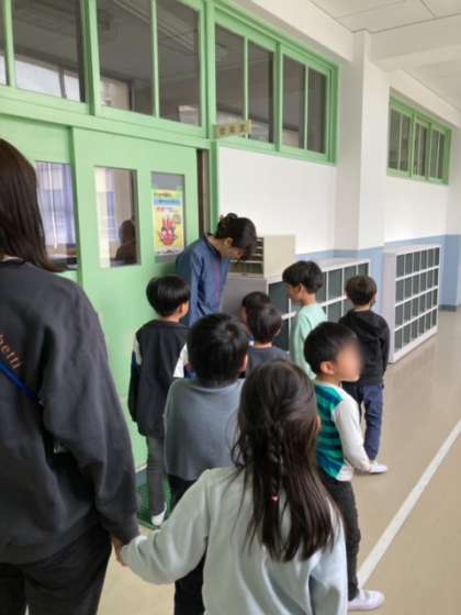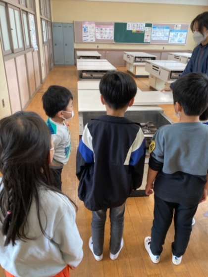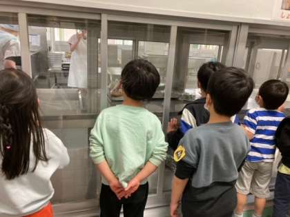 1年生の学校探検です。家庭科室、音楽室を見た後、給食室で、給食調理員さんのお仕事を見せてもらいました。