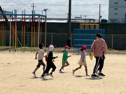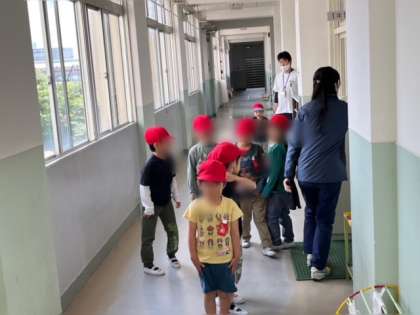 揺れがおさまったので、運動場に避難します。「お、は、し、も」を忘れずに行動しています。