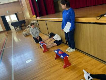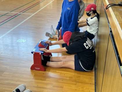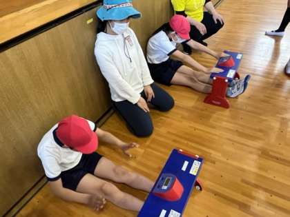 講堂では、長座体前屈をしていました。柔らかい体はケガを防ぎますね。
