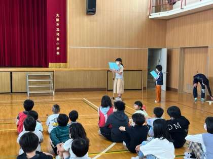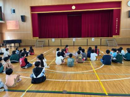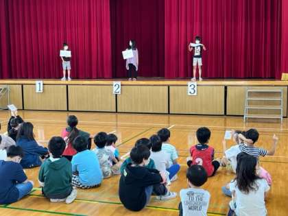 今日の集会は「カーテンの間に注目」です。カーテンの間を何が通るかな?