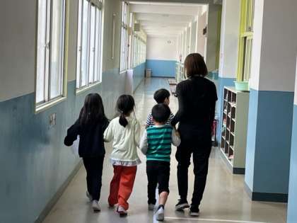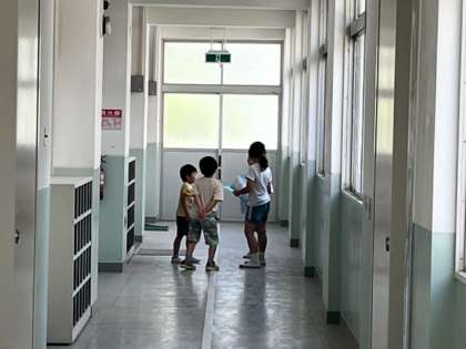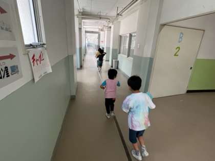 1年生が2年生と一緒に学校探検をしていました。「家庭科室はどこ?」「この部屋は何?」と広い学校を探検していました。