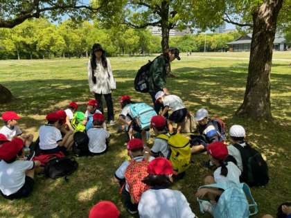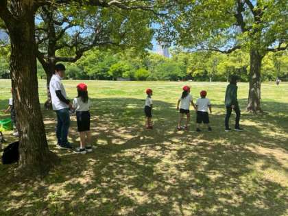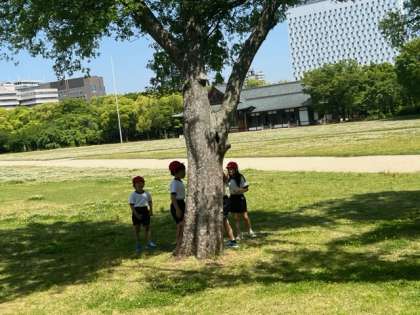 西の丸庭園で遊びます。鬼ごっこが始まりました。楠のあなに興味津々の子もいます。