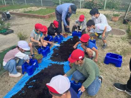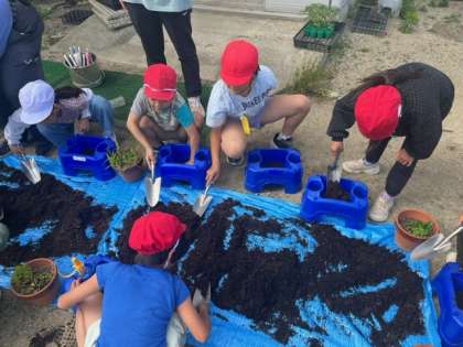 2年生が学習園で栽培ポットに土を入れていました。「ミニトマト」「プチトマト」を植えるそうです。