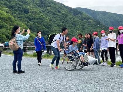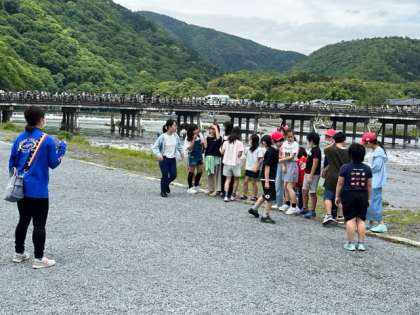 渡月橋の手前で記念撮影です。ハイチーズ