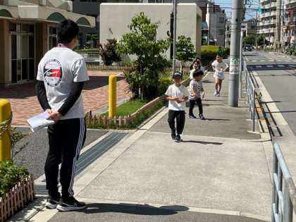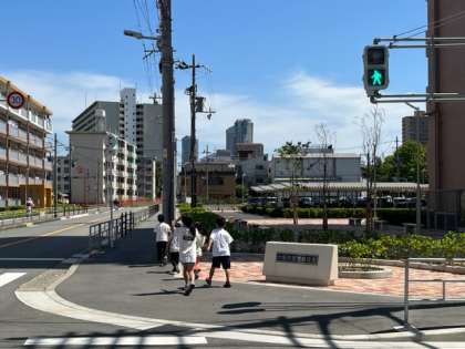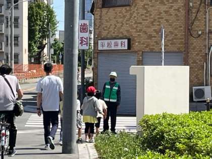 信号のある交差点や駐車場の出入り口は特に気をつけて歩きます。見守り隊の方も声をかけてくださいました。