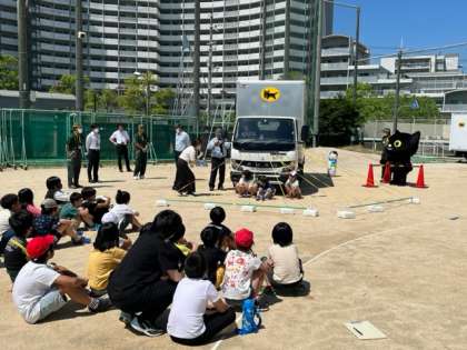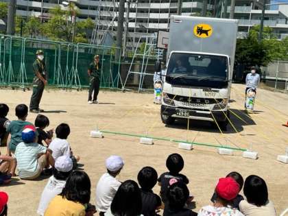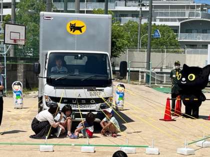 つぎに、トラックの運転手から見えないところについて学びました。トラックの周りは危険がいっぱいです。