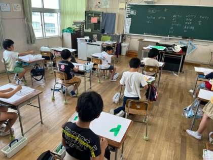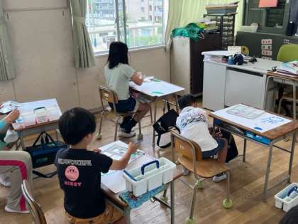 3年生が6月の絵を描いていました。虹や雨、新緑など思いのままに描いています。