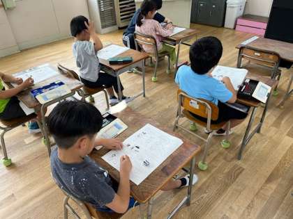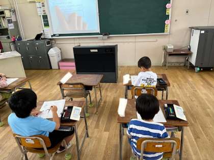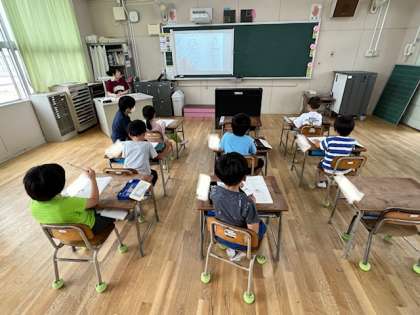 1年生が算数のプリントをしていました。テストなのかもしれません。「もうできた。」が聞こえてきます。