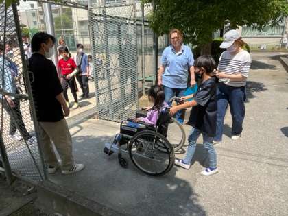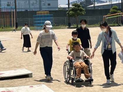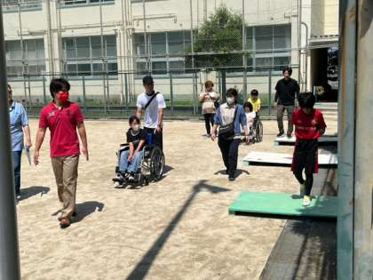 今年度からは、運動場の土の上も体験しました。校舎内より重く感じるようです。