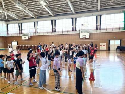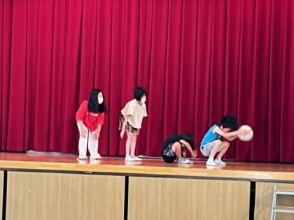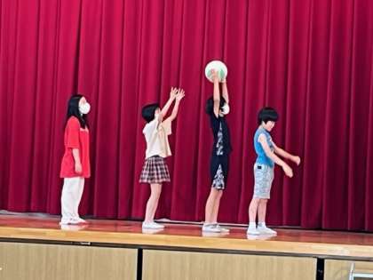 今朝はボール送りのゲームです。前で集会委員会のみんなが手本をしてくれました。