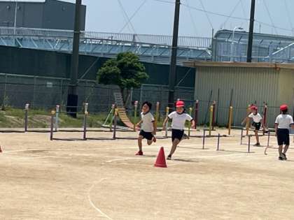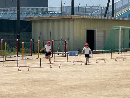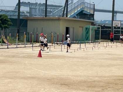 3年生が小型ハードル走をしていました。リズムよく最後まで走ります。振り返ってたらだめだよ。
