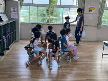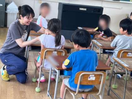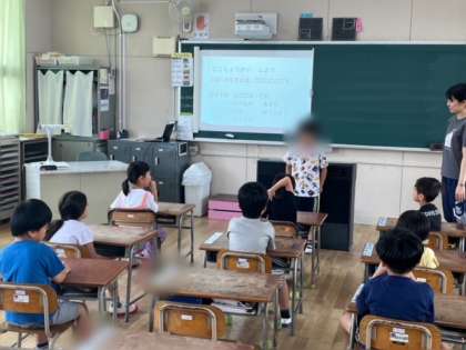 1年生の教室にカナダからの体験入学のお友達がきました。みんなで自己紹介したりゲームをしたりして仲よくなります。名札をつけてもらって嬉しそうです。